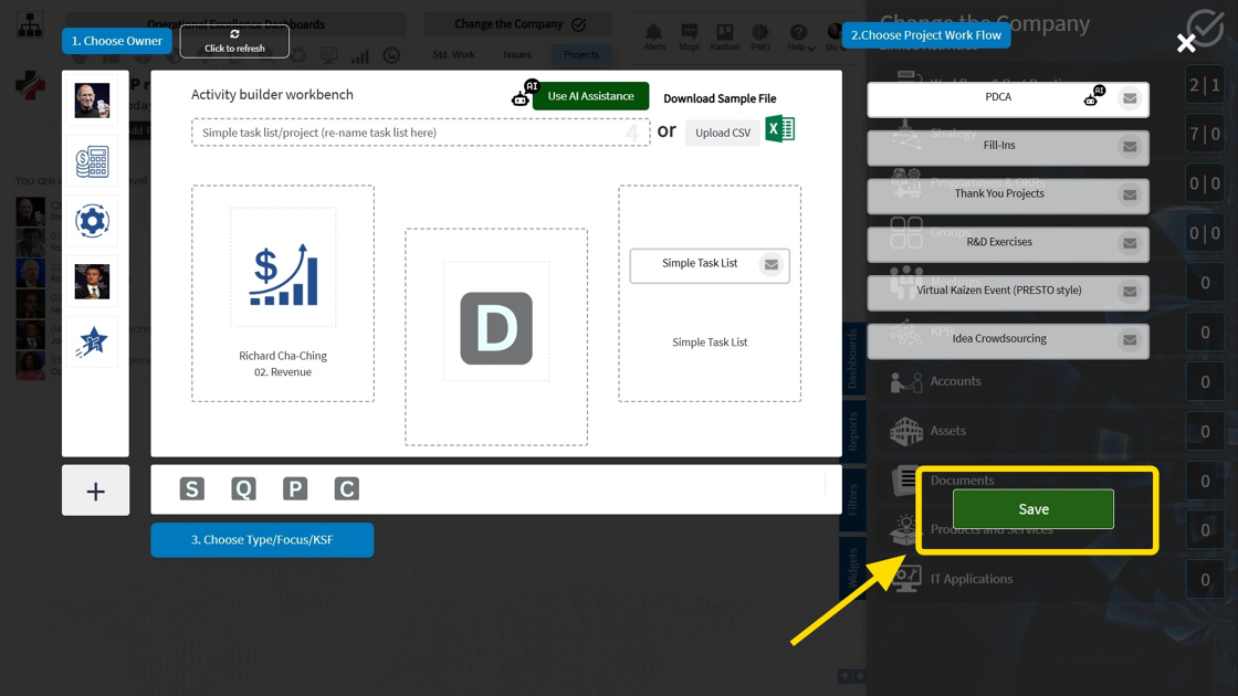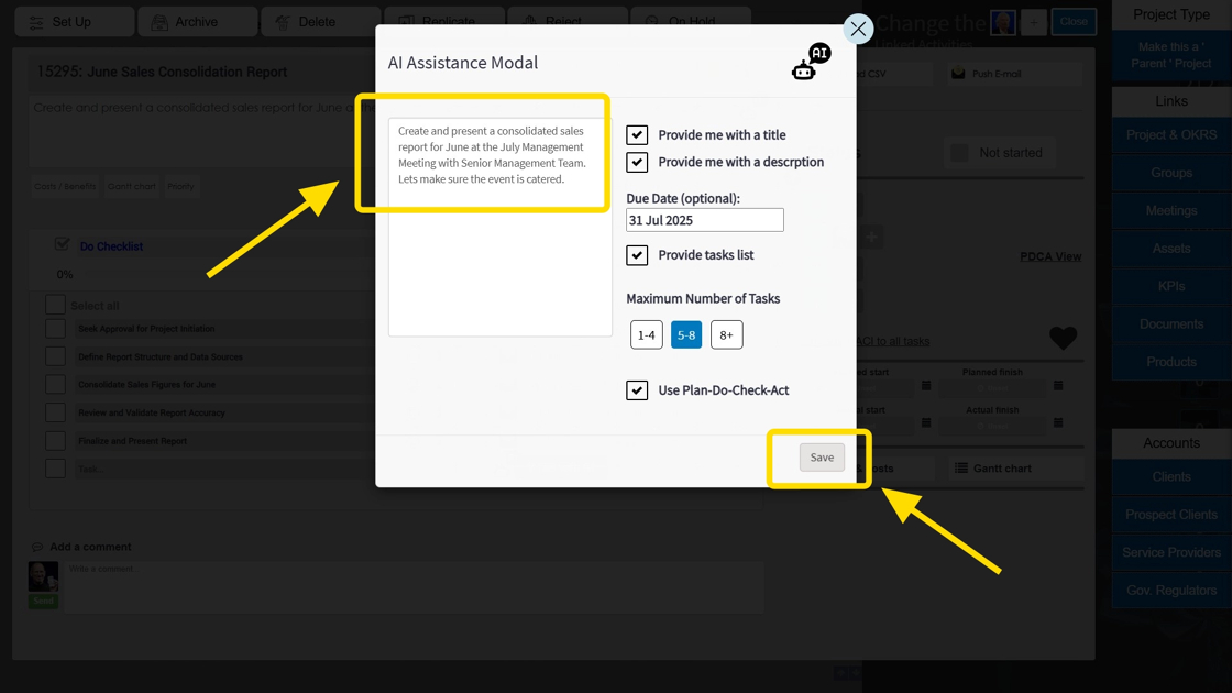 6. Choose the number of desired tasks & save. (Note - select the 'Use Plan-Do-Check-Act box to allow for the AI-Assistant to automatically assign the PDCA logic to your project)