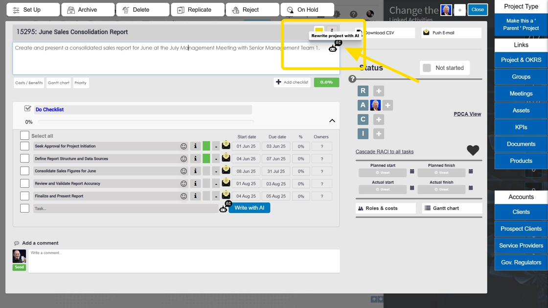 In this example, we would like to review and add additional tasks to project 15295 using the AI Assistant