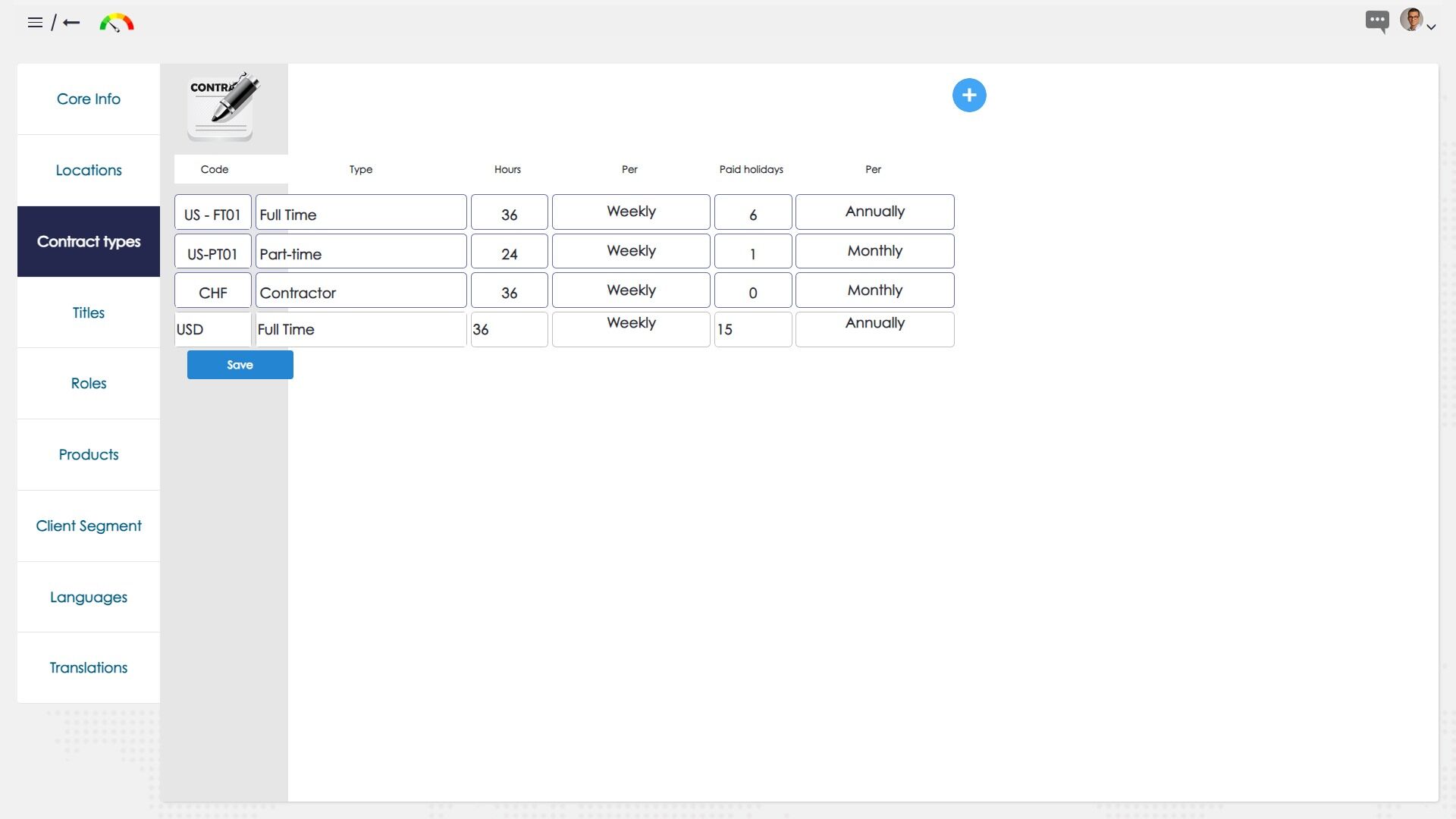4. Enter code, type, hours & paid holidays. Save