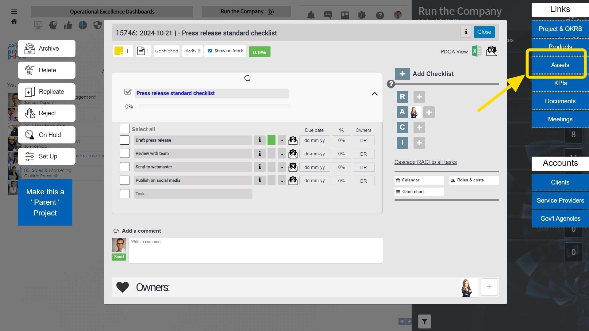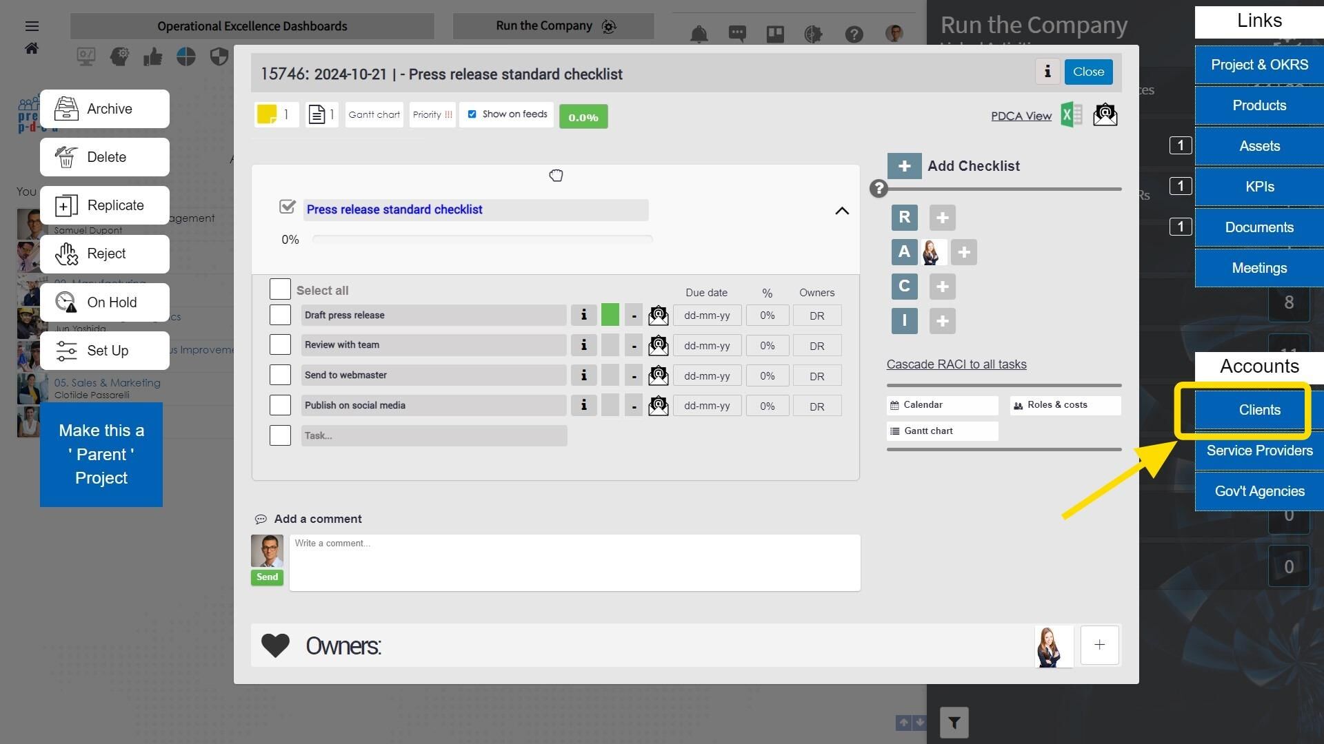 In this exercise, trainers and trainees will focus on the importance of establishing good practices when setting up task lists within Presto PDCA. By utilizing the smart link feature directly on the dashboard, users can efficiently link their tasks to various company elements, such as strategic objectives, grouped projects/OKRs, KPIs, clients, vendors, service providers, assets, documents, recurring meetings, products, and IT applications. Taking a few moments to create these intelligent links not only streamlines work flow but also saves significant time later on, making it easier to filter and manage project listings based on these key elements. This proactive approach will enhance organization and accessibility, setting the stage for effective task management.